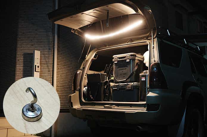 車に取り付けても、活躍の幅は広がります! キャンプ前日に積み込み作業をすることが多い筆者ですが、暗い場所での準備にハンギングテープライトがいい仕事をしてくれました。