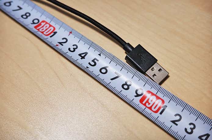 ケーブルの長さは商品詳細に記載がありませんでしたが、実測すると全長約185〜190cmほど。コントローラーはケーブルの中央付近に配置されています。