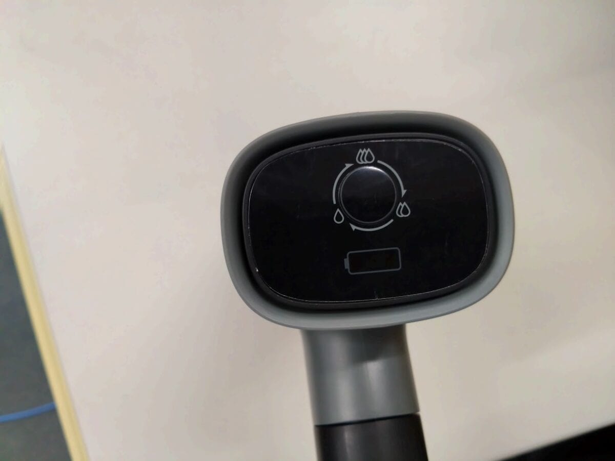 で このボタンが水圧調整なわけね。下のインジケーターはバッテリー残量。そう!この子は洗車時にわずらわしいコードがない充電式なのです!
