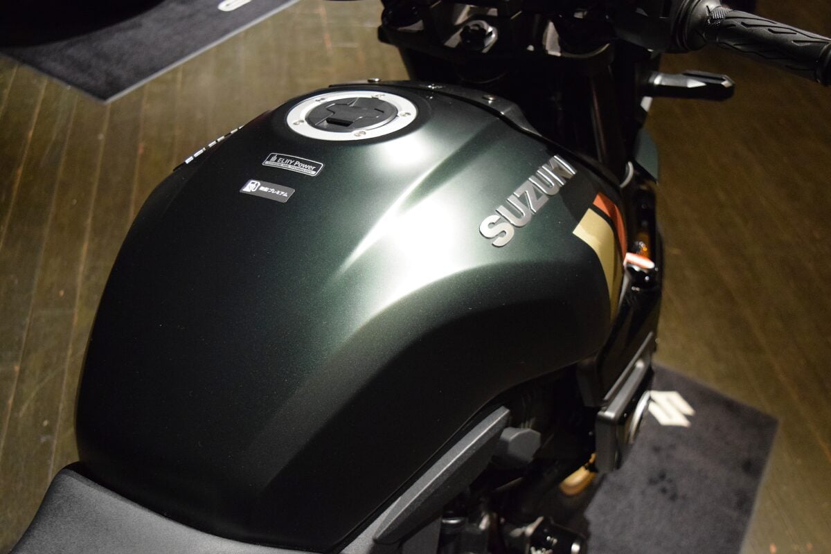 張り出しが強く迫力のある造形が特徴で、旧車イメージのふっくらした曲線美を出すため、手作業で造形がなされている。自然なニーグリップができて、自由度の高いリラックスしたライディングポジションになるような形状に設計されている。ベースとなっているストリートファイター「GSX-8S」とは、ハンドル・ステップ・シートの3点の位置は変わらないのだが、このタンク形状とシートの作りの違いとが相まって、全く違う乗り味になっているということだ。これは後日、実際に乗った際に確認してみたい。