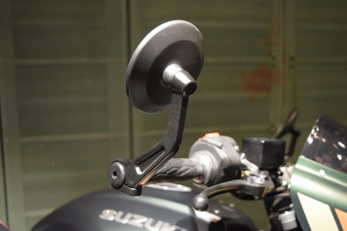 邪魔にならないスリムでコンパクトなハンドルバーエンドミラー。滑らかで上質な質感を持たせるため手作業で造形がなされていたり、野暮ったくならないように硬度の高い素材を採用してスッキリさせたりなどの工夫がされている。当然ながら後方視界についてもしっかりと考えられており、一見、丸形のバーエンドで後方の視界が悪そうというイメージを持つ人もいると思うが、通常のミラーを採用している「GSX-8S」と同等以上の後方視界確保ができるよう設計されている。さらに、ミラーがハンドルバーエンドにあることで、前方の視界がひらけて開放感があり、より快適なライディングに繋がる。