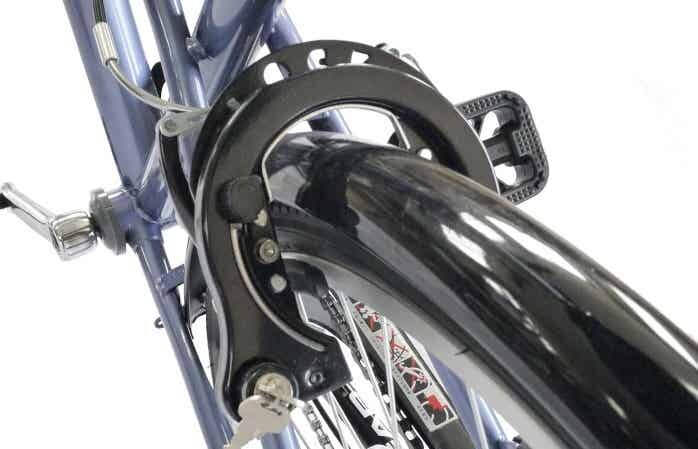 リアディレイラーガードを装備しており、自転車が倒れても変速機を守ってくれます。両足スタンドに比べて倒れやすい片足スタンドには、ありがたい装備です。