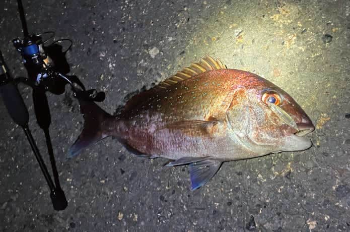 潮がヨレたポイントをただ巻きしていると前アタリがあり、そこでフォールを入れてやると、「ゴン!」と食ってきた一枚です。