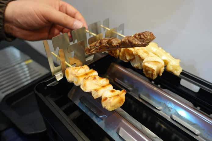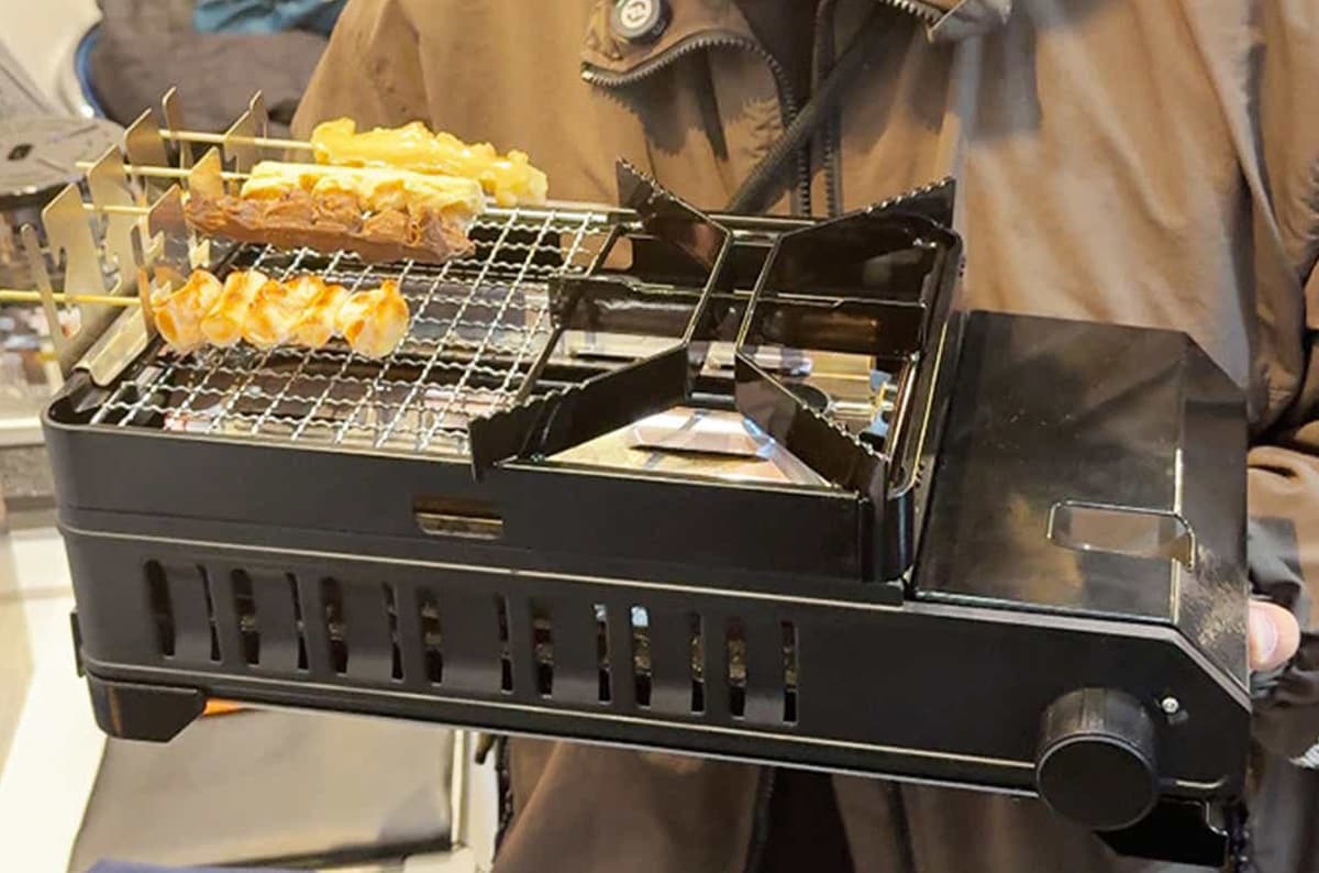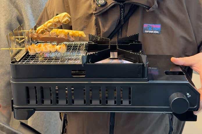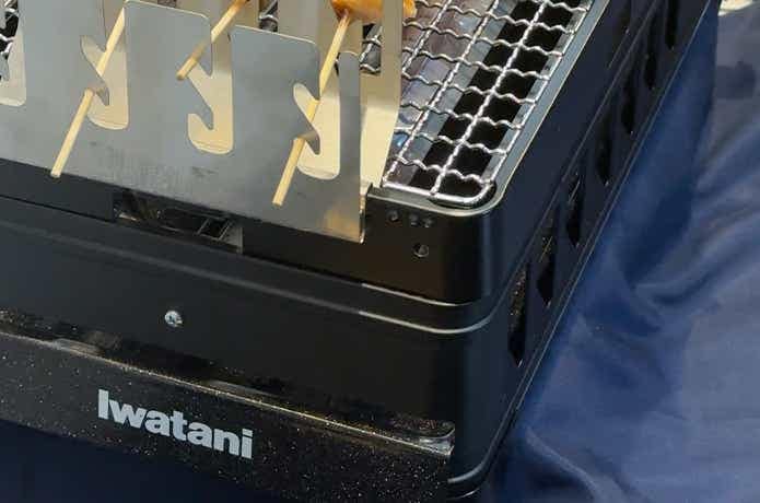 串焼き用の台も別売りアクセサリー。写真は本体の短辺に串焼き器を設置しているが、長辺に設置することもできる