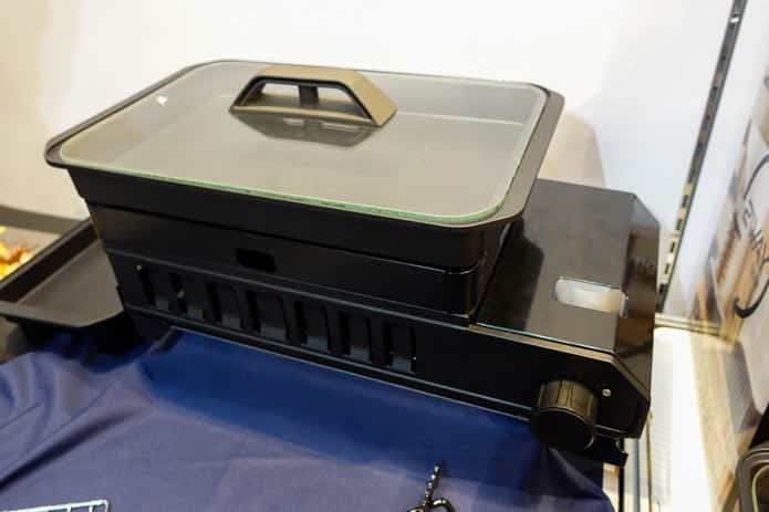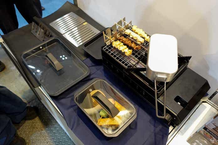 本体には、ハーフサイズの焼き網2枚が付属予定。展示品には、対応アクセサリーがズラリと並んでいました。