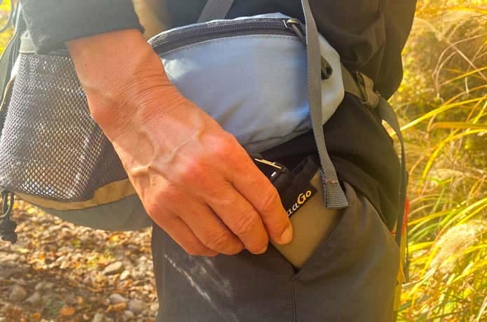 トレイルバンク Sは手のひらにすっぽり収まるようなサイズ感で、トレイルバンク Mは片手で持てるサイズ感といったところ。どちらのモデルも、手持ちのトレッキングパンツやウェアのポケットに余裕で入りました。