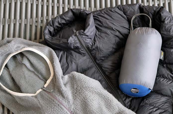 例えばシュラフを薄手の軽量タイプに置き換える場合、最初は予備のダウンジャケットやダウンパンツなどの補完アイテムも一緒に持って行くと、薄手のシュラフでは寒かった場合にも対応できます。