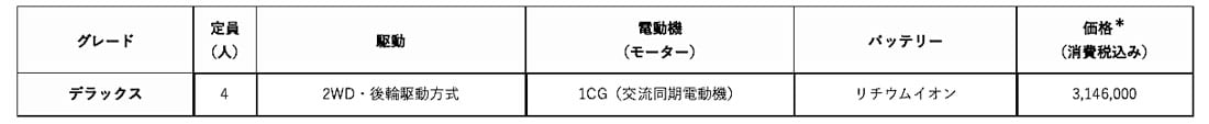駆動ユニットは、モーター、インバーター、減速機を一体化したeアクスルを後輪に搭載。最高出力47kW(64ps)と最大トルク126Nmを発生。後輪駆動による力強い発進とスムーズな加速を実現しストレスなく快適な走りを実現している。