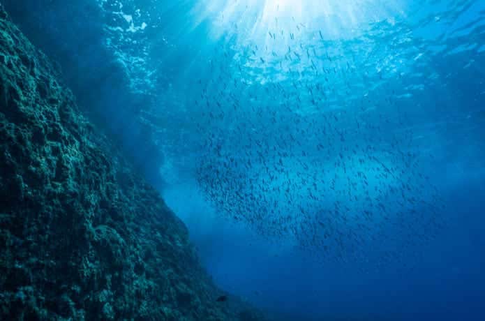 重力によって弱ったエサが沈んでくることを知っている魚たちは、落ちるものに反応を示す習性を持っています。