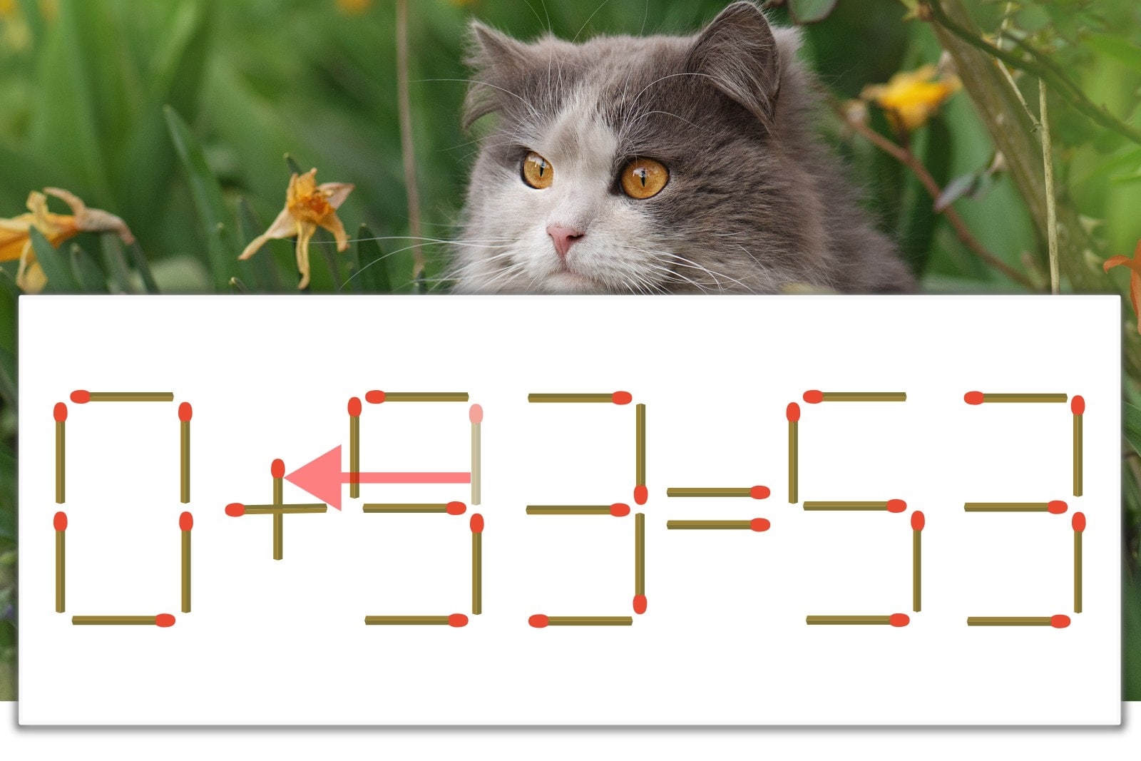 「9」を別の数字に変化させると答えが導き出せます。「9」のマッチ棒を1本移動して、「-」を「+」にしてみましょう。すると、「0+53=53」が成立します。