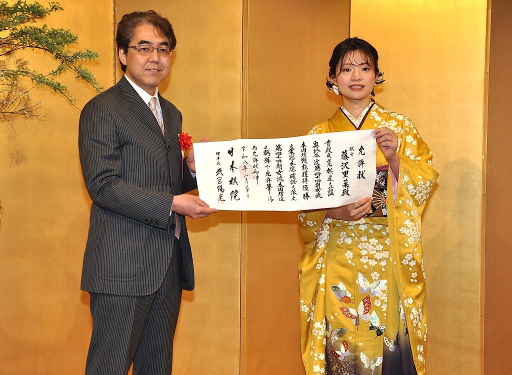 允許状(いんきょじょう)を授与した日本棋院の武宮陽光理事長は「連覇を続け、通算10期の大台に向けてさらなる高みを目指してほしい」と今後の活躍に期待した。
