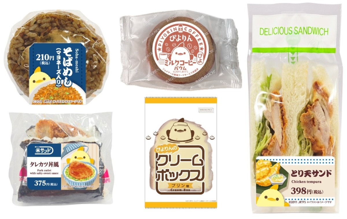 スイーツだけでなく、ガッツリ系グルメも登場!「とり天サンド(398円)」や「米サンドタレカツ丼風(375円)」など、温泉地の名物料理をイメージした20種類もの商品が登場。パッケージには、手ぬぐいを頭に乗せた愛くるしいぴよりんがデザインされています。
