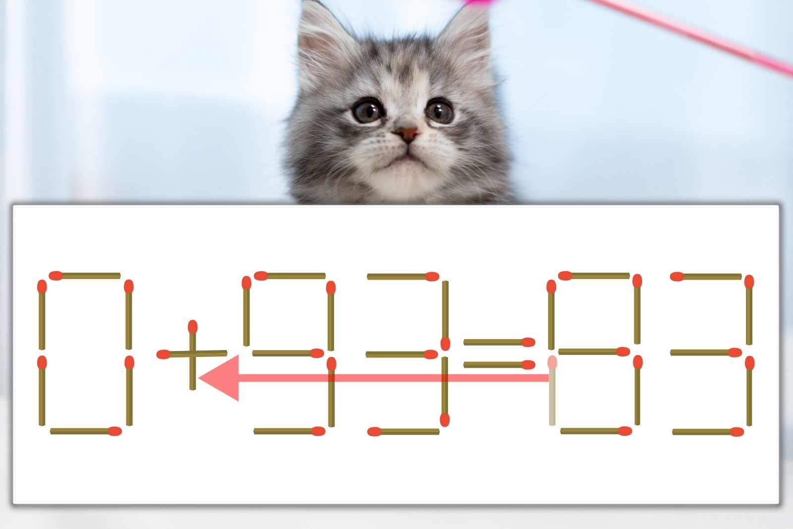 「8」を別の数字に変化させると答えが導き出せます。「8」のマッチ棒を1本移動して、「-」を「+」にしてみましょう。すると、「0+93=93」が成立します。