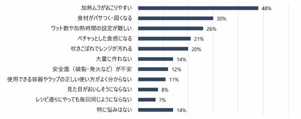 調査は、電子レンジを持っている20歳以上の600人に、2025年12月26日に実施。全体の約57%が電子レンジ調理を日常的に行っており、そのうち48%が「加熱ムラが起こりやすい」と悩んでいた。電子レンジ調理をしない人の理由も、「加熱ムラが出るなど上手にできない、できなさそう」(27%)という項目が最多。ほかにも「電子レンジ調理のレシピを知らない」、「火を使った調理のほうがおいしいイメージがある」という理由が上位に入った。