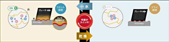 ウェット路面でも違和感なく走れたのは、こうした仕組みが効いているからこそ。この性能は「水スイッチ」と呼ばれています。