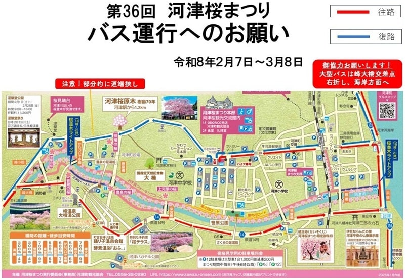 JR三島駅と土肥港から来場する方法もあります。JR東海ツアーズでは、EXサービス(エクスプレス予約・スマートEX)会員の限定プランとして「河津桜まつりワンコインバス」を運行しています。運行日は2月11日(水祝)・13日(金)~15日(日)・20日(金)~22日(日)・23日(月祝)、27日(金)~3月1日(日)・6日(金)~8日(日)。乗車前日の12:00までのWEB予約制で、先着順となっています。片道ひとりあたり500円で、所要時間は約2時間です。