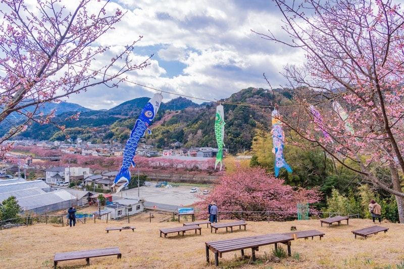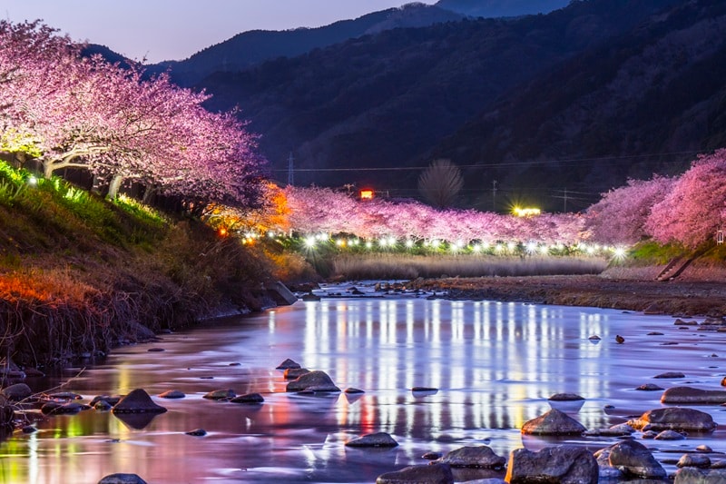 第36回河津桜まつりガイド【2/7~3/8】約850本の桜が川沿いを彩る早咲き桜の聖地、見頃時期やライトアップ・アクセス・ループ橋の絶景まで紹介