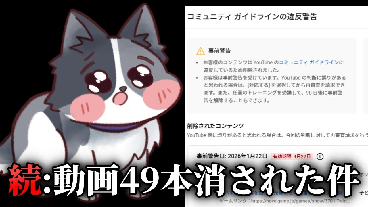 また、一部復活が認められた一方で「結局このチャンネルの違反回数は残ったまんま」とし、動画が一部でも削除された状態だと警告表示が3カ月間残り続ける点が「非常につらい」としています。