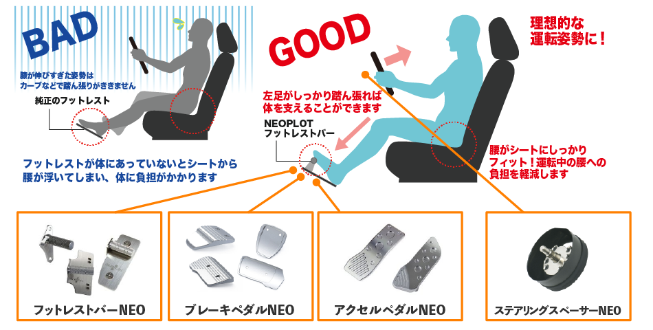 NEOPLOT(ネオプロト)フットレストバーNEOは、ドライビングポジションを決めるうえで、最も重要な左足(軸足)を置く “フットレストのポジションを最適化”するために開発。