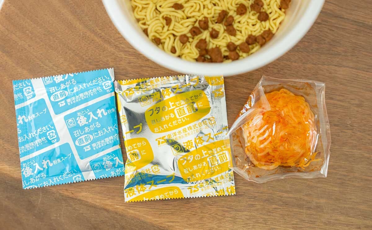 カップの中には、麺とかやくの他に「後入れ粉末スープ」と「液体スープ」「辛もやし調理品」が入っています。