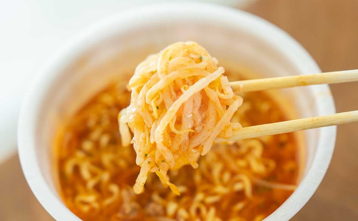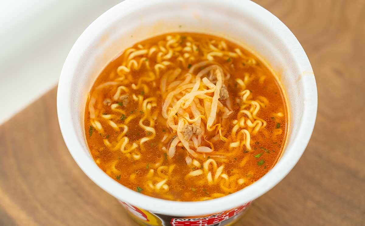 チキンとポークのうまみをベースにしたスープは、にんにくの香りとうまみも感じられ、ほどよく辛みもあり、パンチのある味わいに仕上がっています。シャキッと食感のもやしもピリ辛な味わいです。歯切れのよい、やや太めの麺に旨辛な醤油スープがマッチしてめちゃウマ! 「でかまる」らしいボリューム満点の一杯だから、量にも味にも大満足。これはリピートしたくなるカップ麺ですね。