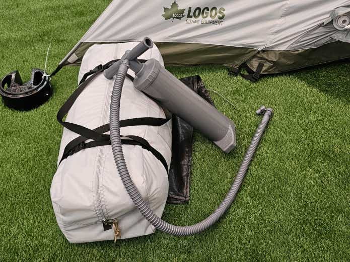 専用ポンプで15回程度空気を入れ込めば自立。ポンプもそれほど硬くなく、力に自信がない方でも簡単に設営可能です。