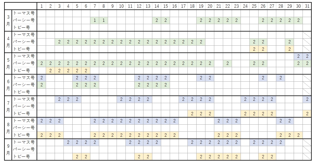 2026年の運行は、大きく分けてパーシー号、トーマス号、トビー号の3つのラインナップで展開されます。