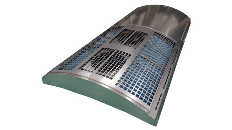 電車や気動車の屋根に載るのが鉄道車両用の空調装置(屋根上集中式)。2026年1月に登場した新製品は、開閉角度が調整可能なダンパー(流量調整装置)を装備する省エネ性能に加え、摩擦帯電フィルターや電流センサーによる省メンテナンス化がセールスポイントだ。