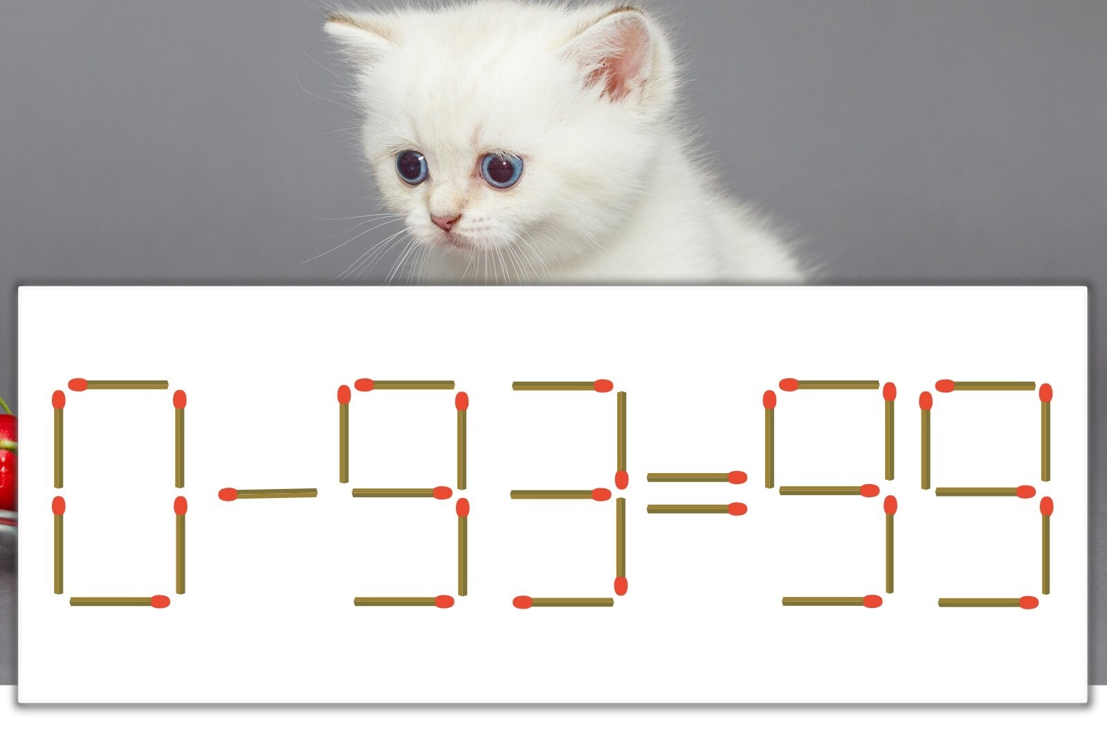 「9」を別の数字に変化させると答えが導き出せます。一の位の「9」のマッチ棒を1本移動して、「-」を「+」にしてみましょう。すると、「0+93=93」が成立します。