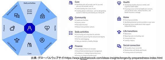 ヒントになるのが、マニュライフが米マサチューセッツ工科大エイジラボ(MIT AgeLab)と2025年に共同開発した長寿準備指数(LPI: Longevity Preparedness Index)です。高齢期にどれだけ充実した生活を送る準備ができているかを、社会的つながり、経済、日常活動、介護、住まい、地域社会、健康、ライフステージの移行の8つの分野で測定するものです。