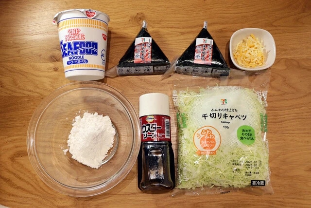 (2)生地! 薄力粉、ウスターソース、水をボウルに入れて泡立て器でしっかり混ぜる。薄力粉のダマがなくなったらキャベツも投入。キャベツはコンビニのパック野菜を使うと便利だ