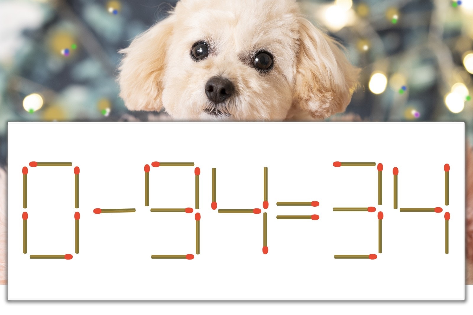 「9」を別の数字に変化させると答えが導き出せます。「9」のマッチ棒を1本移動して、「-」を「+」にしてみましょう。すると、「0+34=34」が成立します。