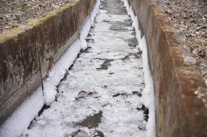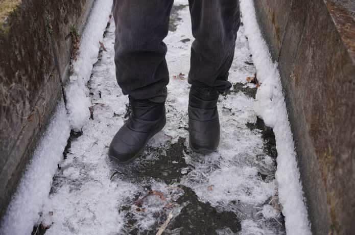小川へ向かう道の傍にちょうどいい感じに凍っている側溝があったので、防滑性のチェックのために入ってみました。さすがにツルツルの氷は滑るんじゃないかな〜、と半信半疑の筆者。