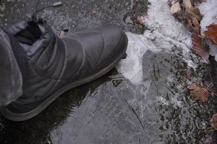 一部凍っているところもありとても冷たそうですが、防水部分より上に水が来ないように慎重に浅瀬へ侵入。しばらくウロウロしてみましたが、水が染みてくる気配はなく、記載の通りの防水性が確認できました。
