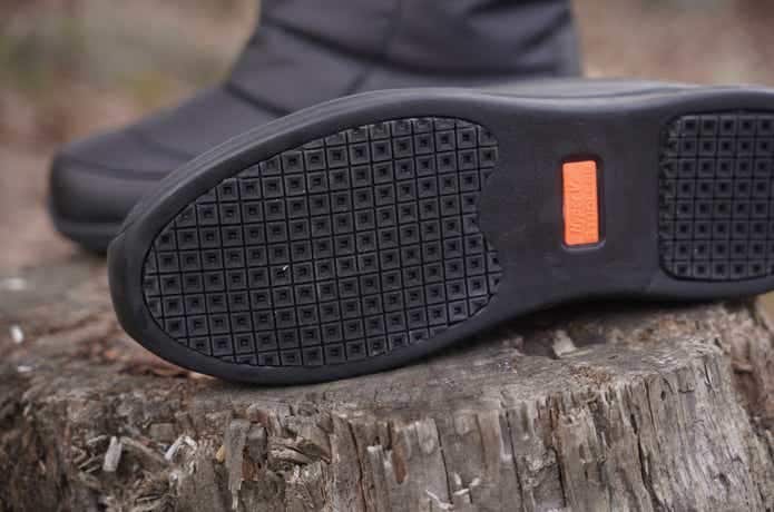 滑りにくさも魅力のひとつで、その秘密は「ハイパーV」というモノタロウ独自のスタッドレスソール。柔らかい特殊ゴムと独特なソールの形状により、滑りやすい路面での耐滑性が高められています。