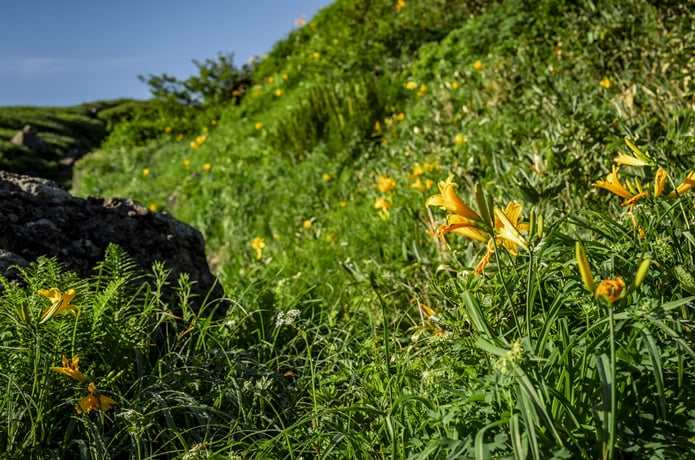 御沢野営場から三国岳を越えると、そこからは高山植物が咲き誇るお花畑と、清涼感あふれる稜線がどこまでも続いていきます。