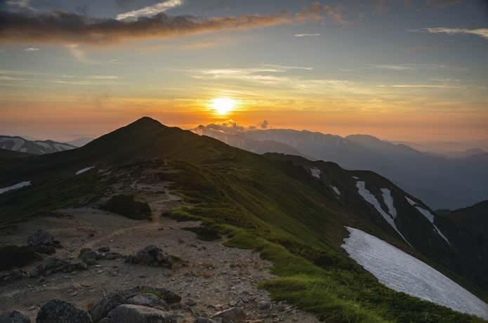 山域が非常に大きく、山頂へは行程が長い、万年雪が残るなど登山には入念な準備が必要。厳しさがある反面、初夏には固有種のイイデリンドウやハクサンイチゲなどが咲く、花の山でもあります。