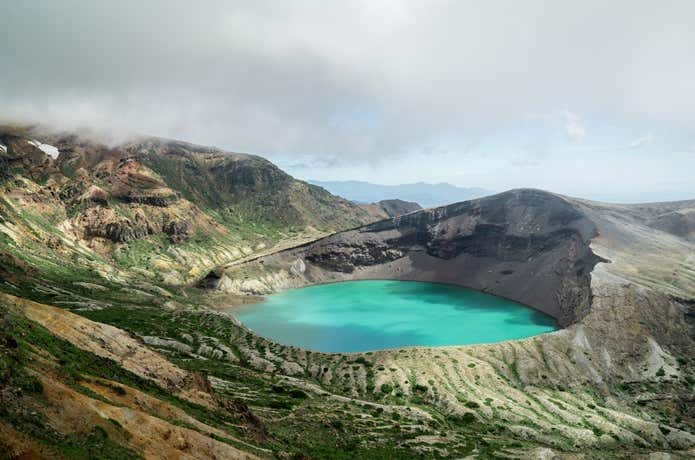 エメラルドグリーンに輝く火山湖「お釜」が象徴的な東北の名峰。