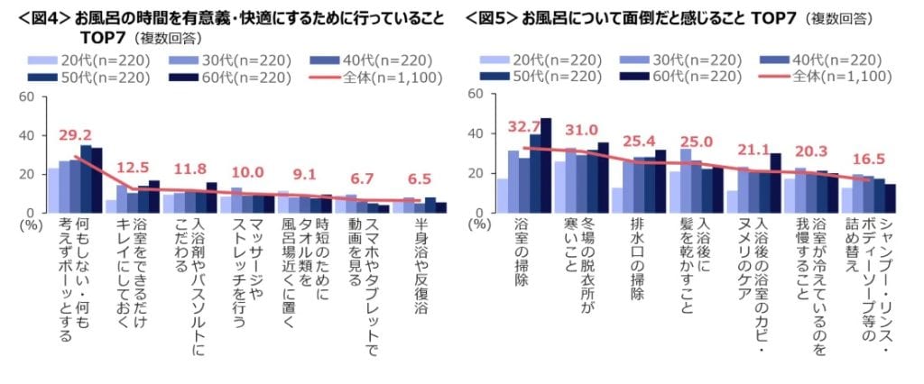 お風呂時間を有意義・快適にする工夫として最も多かったのは「何もしない・ボーッとする」(29.2%)。次いで「浴室をできるだけキレイにしておく」(12.5%)、「入浴剤やバスソルトにこだわる」(11.8%)という結果に。ただ、20代においては、浴室を清潔に保つ意向が他年代より低く、掃除への意識差が年代で分かれる結果となった。