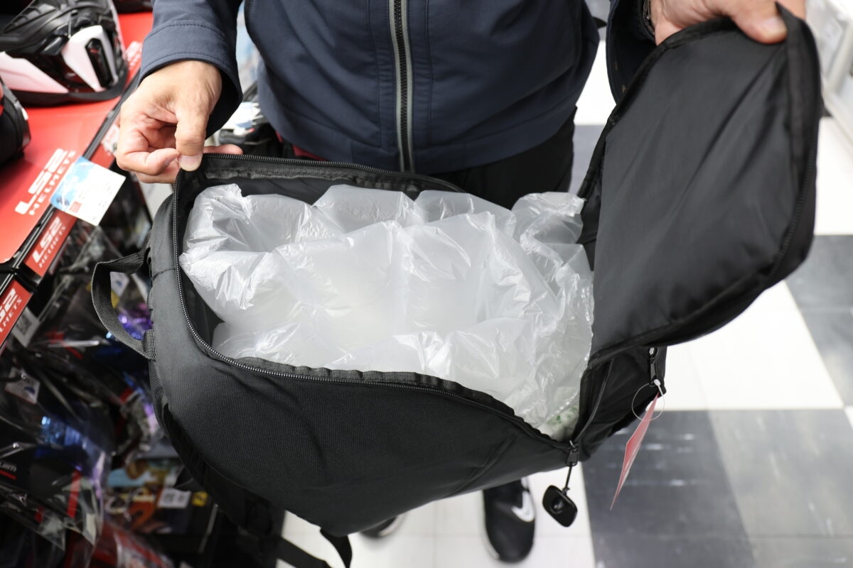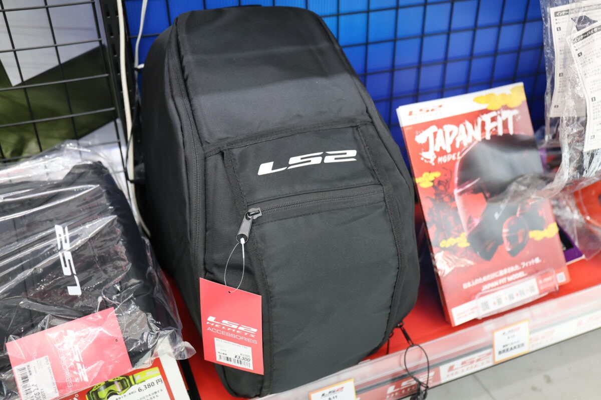装備品や付属品ではないのだが、「LS2の『ヘルメットバッグ3』が人気商品」だと岡さんは言う。修理や車検で預けた時、他にもレンタルバイクを楽しむ時などに重宝するアイテムだ。人気の秘密はリュックタイプであることと、大容量であること。