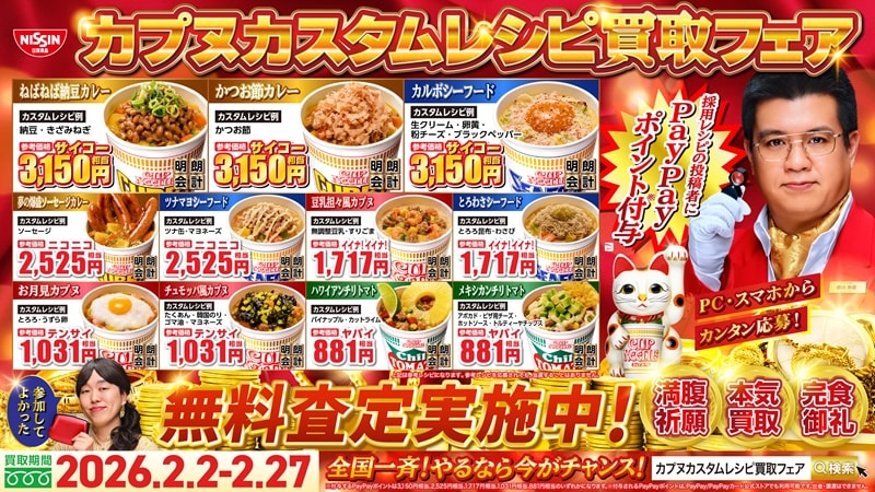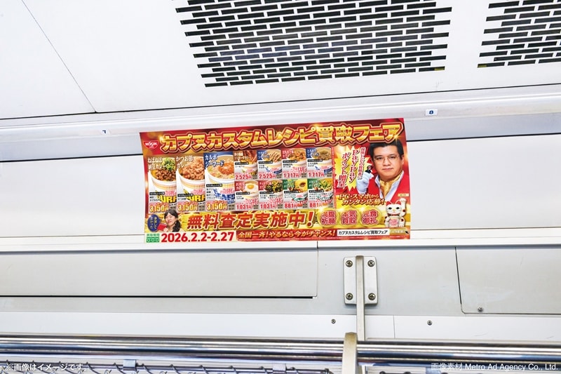 日清食品が、貴金属・宝石などの買取専門店の「買取キャンペーン」をオマージュした「カプヌカスタムレシピ買取フェア」を開始しました。これに伴い、2月8日(日)まで東京メトロ銀座駅コンコースに買取専門店風の広告が、また2月17日(火)まで東京メトロ全線・東武本線の車両内にまど上広告が掲出されています。