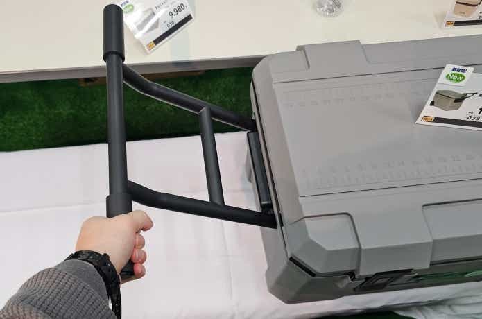 このモデルはハンドル幅が広い分、クーラーボックスを身体の少し横にずらして持つことができ、歩くリズムを崩しにくくなっています。重量物を運ぶシーンを想定した、実用目線の工夫ですね。