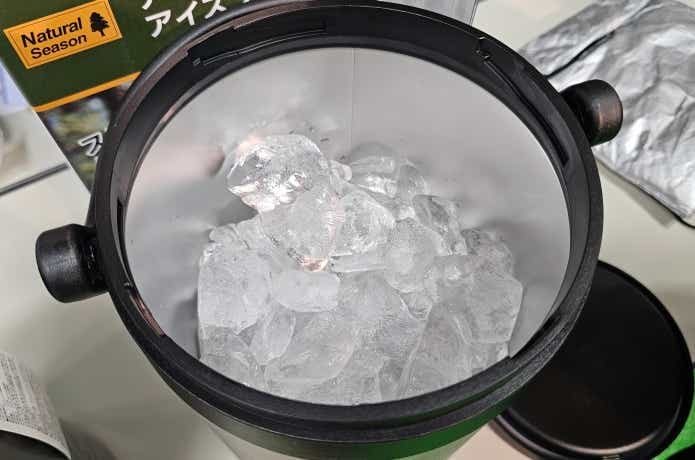 保冷性能も申し分なし。撮影は2月6日11:00ごろで、氷を入れてから約22時間が経過していましたが、ご覧のとおり氷はしっかり凍ったままでした。