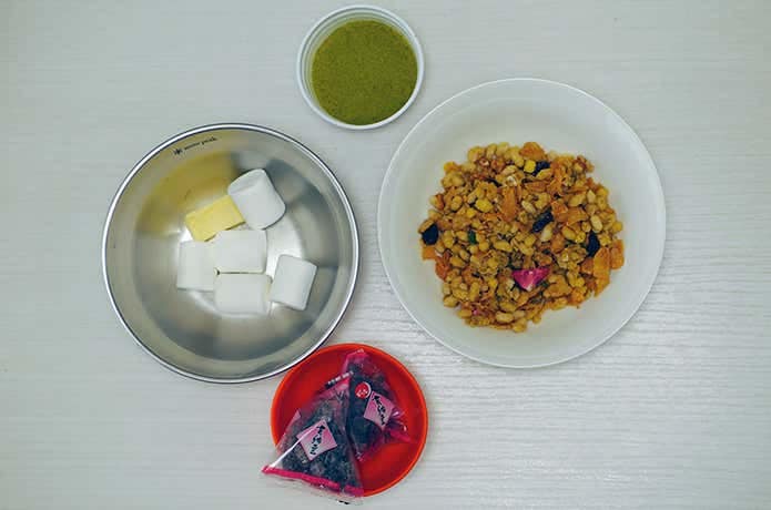 - 耐熱性の器にマシュマロとバターを入れ、電子レンジ500Wで30秒加熱して溶かす。スプーンなどでよくかき混ぜておく。