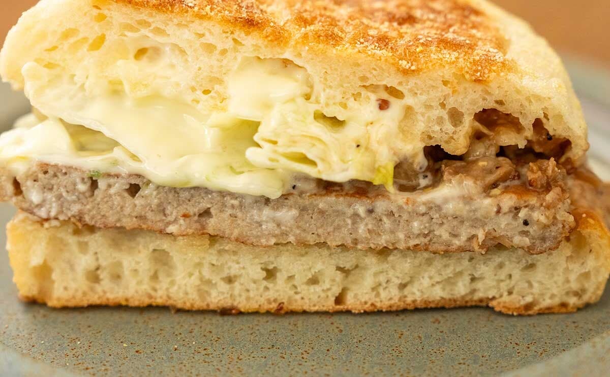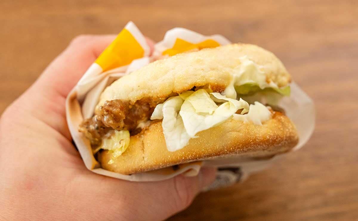 ビーフフィリングはビーフのうまみだけでなく、オニオンのうまみ、粒マスタードとブラックペッパーのキリッとした風味も感じられて◎。肉肉しいソーセージパティと相まって、なんだかステーキを食べているような気分になりますね。まろやかな味わいのスイートレモンソースと、さっぱりとしたレタスがアクセントになって、とてもおいしいです。