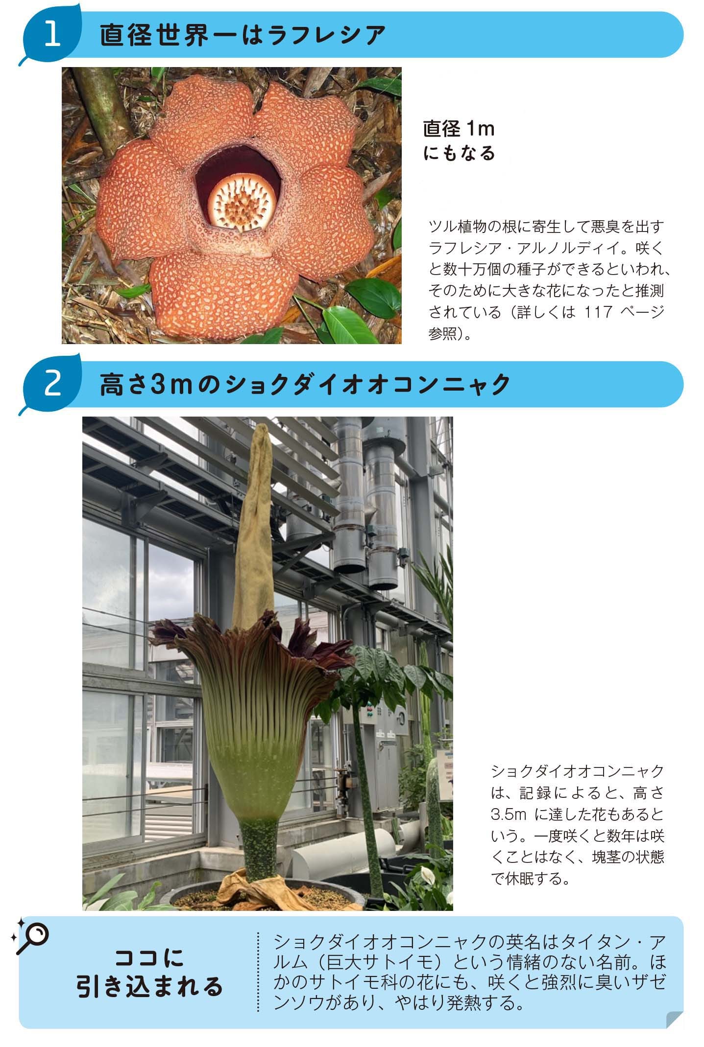 世界一大きな花といえば、インドネシアのジャングルで咲くラフレシアが有名です。他の植物に寄生して花が咲き、直径1mにもなります。