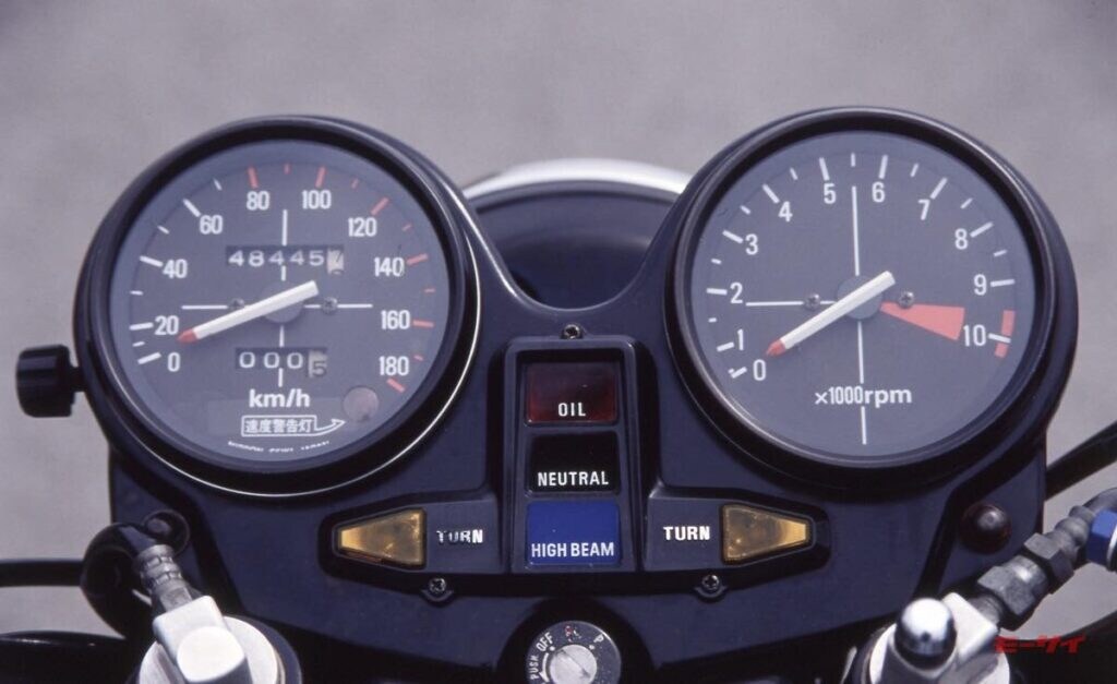■ソリッドなブラック仕上げの2連メーター。レンズは光反射が少ない材質を採用し、シャープな針の動きの回転計は当時は斬新なものだった。ワーニングランプは夜間だとまぶしいほどに明るい。