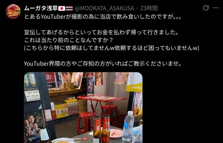 「宣伝してあげるから」と言ってYouTuberが無銭飲食? 浅草のタイ料理店のX投稿が波紋
