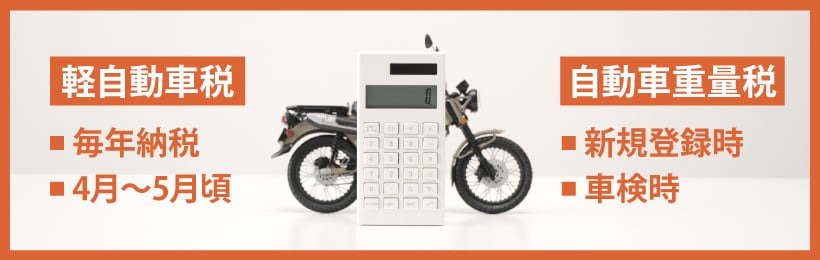 1つが軽自動車税で、排気量によって金額が異なり、年に一度納付します。もう1つは、自動車重量税です。自動車重量税は、新車購入時や車検時に支払う税金で、バイクの重量と用途に応じて課税されます。ただし、125cc以下のバイク(原付)は、自動車重量税が課税されません。