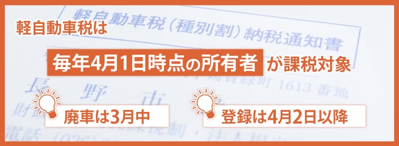 4月1日の最終の所有状況で判断されるため、4月1日以前に廃車手続きを完了させると、その年度の軽自動車税を納める必要がなくなります。4月2日以降に手続きした場合、その年度の軽自動車税の支払いが必要です。基本的には、3月末までに廃車手続きを完了させるようにしましょう。